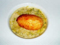 nnen ons weerzien echter met een mogelijke nieuwe klassieker, een warme quenelle met een luchtig gehakt van garnalen, en begeleid door zowel spitskool als een mooie, licht romige saus waarin o.a. nootmuskaatjus was verwerkt, absoluut verrukkelijk (€15, zie foto). Een aardige wijn hierbij (en bij de eendenlever) is de enigszins milde, enigszins kruidige, zacht frisse Pinot Blanc Auxerrois 2007 van de Elzasser producent Mittnacht (glas €5,50, fles €30). We hoorden tevreden geluiden over de gebraden lamscarré, vrij pittig van karakter met ook een duidelijk paprika-accent (€35, kleine portie €25). Een beste begeleider daarbij is de door een Fransman in Marokko