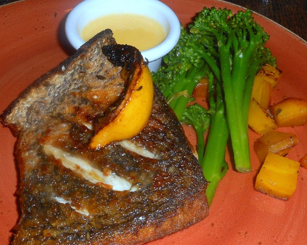 nel 2015 en de tikje rijpe doch correct frisse Mazza Vineyards Riesling 2016. Beide hebben wij tot tevredenheid geproefd bij de stevig gegrilde Australische zeebaars die begeleid werd door o.a. twee soorten gebakken biet en hollandaisesaus ($26). Een volgende keer gaan wij, met een van de rode streekwijnen, het bison meatloaf met een Portachtige saus proberen ($25). Het interieur van The Cork wordt door bruin(rode) tinten bepaald en is ietwat schemerig; bov