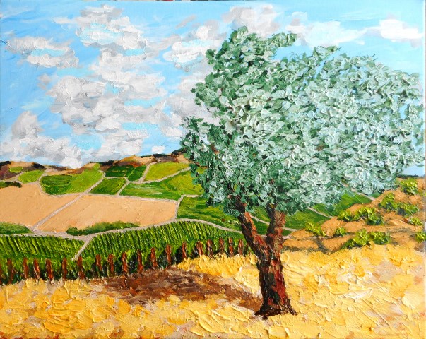 Herinner je nog die mooie, warme, zonnige dagen van afgelopen najaar? Gewapend met een camera ben ik op een van die dagen, het was in de middag, langs ’t Gein gefietst. Waar ik takken met verkleurde, bijna vlammende bladeren zag tegen een donkergroen decor. Met acrylverf heb ik deze impressie vastgelegd, als blijvende herinnering aan een heerlijke nazomer.