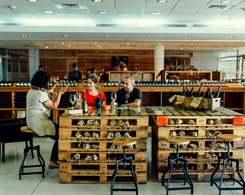 De gistingshal van de Galil Mountain Winery, in Israël, oogt heel efficiënt, met batterijen roestvrijstalen tanks en andere modern materieel, dus voor sfeer blijf je liever in het designachtige proeflokaal (rechts). Om daar kennis te nemen van bijvoorbeeld een kostelijke witte wijn, de Avivim.