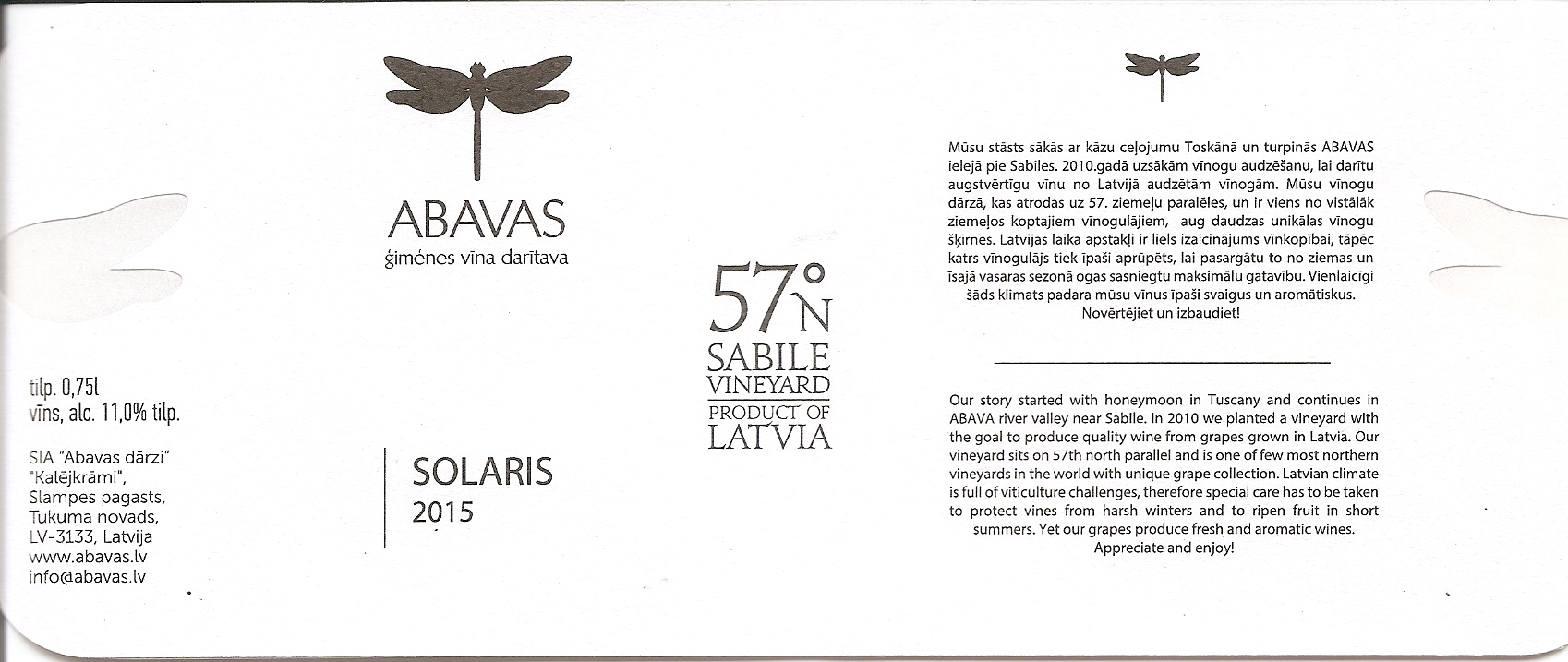 Wat ze in Letland ‘wijn’ noemen, is meestal gemaakt van fruit, zoals appels, peren, kersen, rabarber, etcetera. Echte wijn gemaakt van wijndruiven is gezien de noordelijke ligging (57 graden noorderbreedte) zeer moeilijk. Echter, het dorpje Sabile in de vallei van de Abava rivier, heeft een uniek microklimaat, waar men in 2010 een wijngaard heeft aangeplant met vroeg rijpende, resistente solarisdruiven waarvan de eerste oogsten hebben geresulteerd in een frisse, aromatische, échte Letse wijn. Aldus de grote etikettenverzamelaar Bert Wentzel, jokebertwentzel@gmail.com, uit wiens collectie dit bijzondere label afkomstig is.