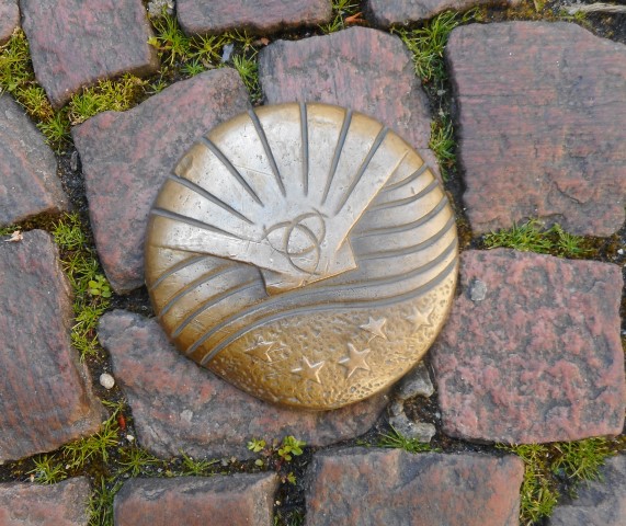 Compostela. Vandaar dat je op en rond het Place Saint-Pierre, bij de gelijknamige kerk, als wegwijzertjes bronzen medaillons tussen de straattegels ziet. Op het driehoekige Place du Palais (rechts) verschijnt de Porte Cailhan in beeld, een versterkte poort d