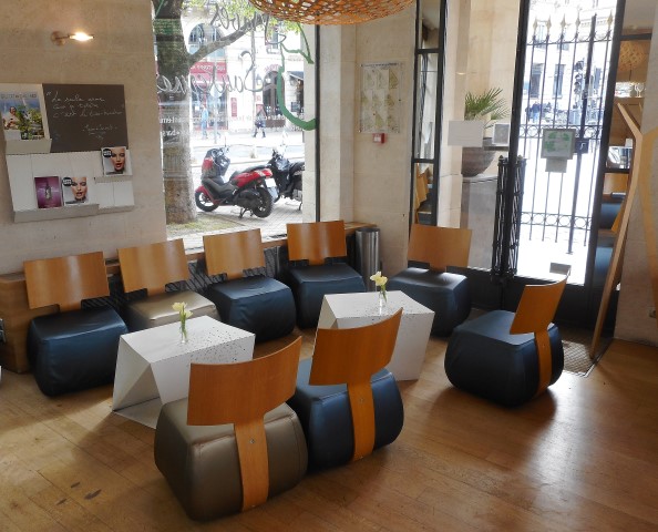 van een hele reeks regionale wijnorganisaties. In de driehoekige, loungeachtige ruimte (rechts) kun je voor vriendelijke prijzen allerlei streekwijnen per glas gebruiken, ook mousserende (à €3), en hartige hapjes nuttigen waaronder plateaus van charcuterie, kaas en foie gras (€8,50 of €9). Er schuin tegenover verdient Café Napoléon (naast L’Entrecôte) een bezoekje, voor een kop koffie bijvoorbeeld, en voor zijn nostalgische, uit 1841 daterende interieur met geornamenteerde muren, een kroonluchter en hoge spiegels. Verderop, langs het Office du Tourisme – voor stadsinformatie zie ook de websites https://nl.france.fr/nl en www.bordeaux-tourisme.com; en een excellente, Nederlandse sprekende privégids is Janneke, adres jwdufourquet88@gmail.com – bereiken we het iconische Monument aux Girondins