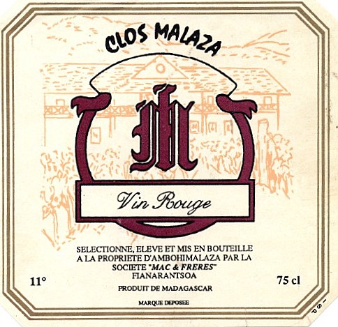 Het eiland Madagaskar, oostelijk van Afrika, werd in 1960 onafhankelijk van Frankrijk en heeft 27 miljoen inwoners. De wijngaarden werden in de 19e eeuw door Franse kolonisten aangelegd op terrassen in de hooglanden rond Fianarantsoa. In totaal zijn 800 hectare met druivenrassen beplant, zoals petit bouchet, villardin, chambourcin en couderc blanc, variëteiten die gewoonlijk eenvoudige wijnen geven.Aldus de toelichting van de grote etiketten verzamelaar Bert Wentzel (jokebertwentzel@gmail.com) die dit label selecteerde uit zijn wereldwijde collectie.