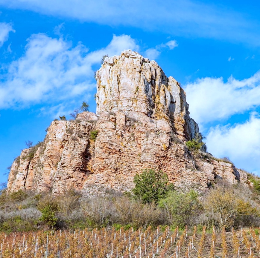 routes door bossen en wijngaarden. In het uiterste zuiden van de Bourgogne en vlak bij Mâcon liggen de fraai door druivenakkers geflankeerde rotsen van Vergisson en Solutré. Als je mijn eerste boek hebt, dan zie je op de cover een illustratie van de Roche de Solutré, die fier boven het landschap uitsteekt. Een bijzondere plek waar je zeker eens een kijkje moet nemen als je in Mâcon of omgeving bent. Rij in dat geval over de D17 en D54 naar Solutré-Pouilly en volg de bordjes naar de Roche de Solutré, waarbij je een museum hebt over de rijke historie van de rots en een pad voor een wandeling naar de top. Het uitzicht daar is prachtig. Hou je van mooie uitzichten? Rij dan verder over de D54 tot je bij een splitsing komt en ga er rechtsaf richting Pierreclos. Er volgt een fantastische rit en iets verder zie je links chambre d’hôte La Grange du Bois.