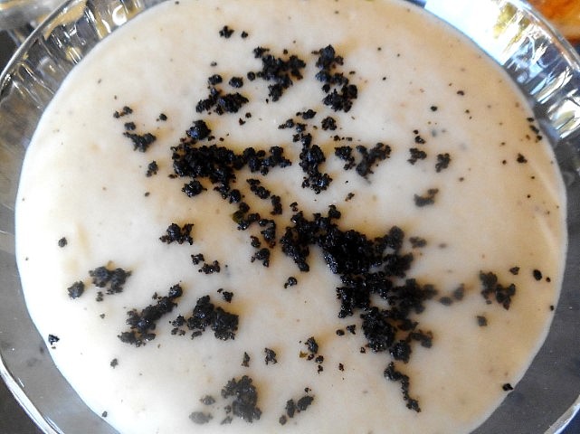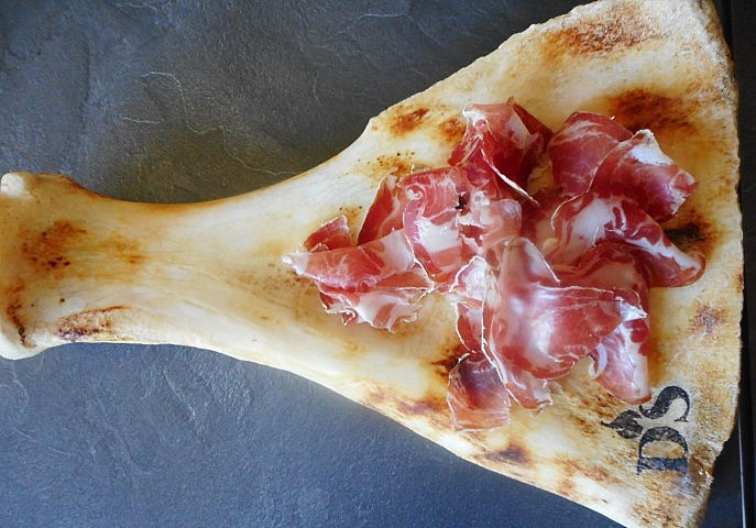 tonijn met erop smakelijke extraatjes (€15,50). Naast dit Japans gestijlde voorgerecht verscheen een prachtige, dimensierijke crème van Parmezaanse kaas plus wat citroen, en geschaafde truffel, met onderin speciaal voor mijn vrouw (zij is vegetariër) geen Angus beef, maar een tomaatje (zonder truffel €13,50, met truffel €23). Genieten ook was het van het eigen gebakken stokbrood. Het was eveneens smullen van de uit hun peul te zuigen jonge, groene sojaboontjes die extra op smaak waren gebracht met een vinaigrette van sesamzaad en soja (€8,50). Ideaal om te delen, wat ook geldt voor de op een schouderbeen geserveerde, door slager Tom de Boeye gedroogde procureurham die minstens zo goed smaakte als een Italiaanse copa. Vandaar zijn naam: Copa di Tom (€7,50 voor 50 gram). Mijn hoofdschotel werd een