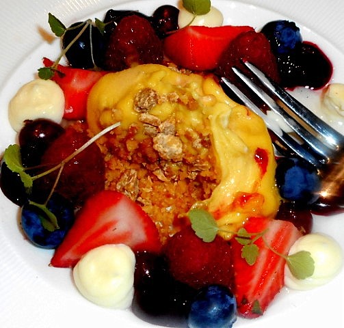 op een schijfje briochebrood geplaatst, en werd bedekt door o.m. een plak superieure foie gras, met erbij wat truffel en een mooi geconcentreerde jus met morieljes. De attente, jonge bediening bracht bovendien een schaaltje hele dikke frites. Een echt smakenfestijn (€39,50). Tot slot arriveerde een smaakrijk dessert met o.a. kleine verse vruchtjes, stipjes witte chocolade en een flinke lepel ijs waarin ook passievrucht en fijn gehakte pistachenoten te proeven vielen. Erbij kwam een miniglaasje bijna vrieskoude, excellente, krachtige limoncello, in Spanje gemaakt door de ouders van Jens Hoogstad en diens broer Bart, mede-eigenaar
