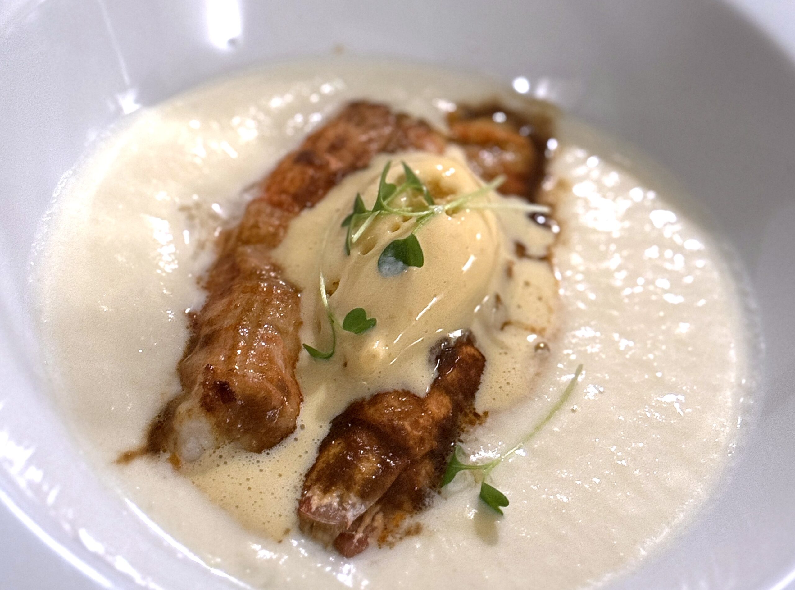 een ‘sauce Bourguignon’ plus een chip Parmezaanse. Een super smakelijk voorgerecht; het kostte moeite om het bord niet schoon te likken. Aan de overkant (zou Wina Born hebben geschreven) werden twee langoustine staarten geserveerd in een schitterende saus van bloemkool en peer, een wonderschone combinatie verrijkt met een bisque van ponzu met zee-egel. Je zou het bord erbij op willen eten zo goed. De 2023 van Domaine d’Aupillac was een volmaakte tafelgenoot, zeer fijn, elegant, beheerst, droog, zacht en met een héél kleine hint van zwarte truffel.