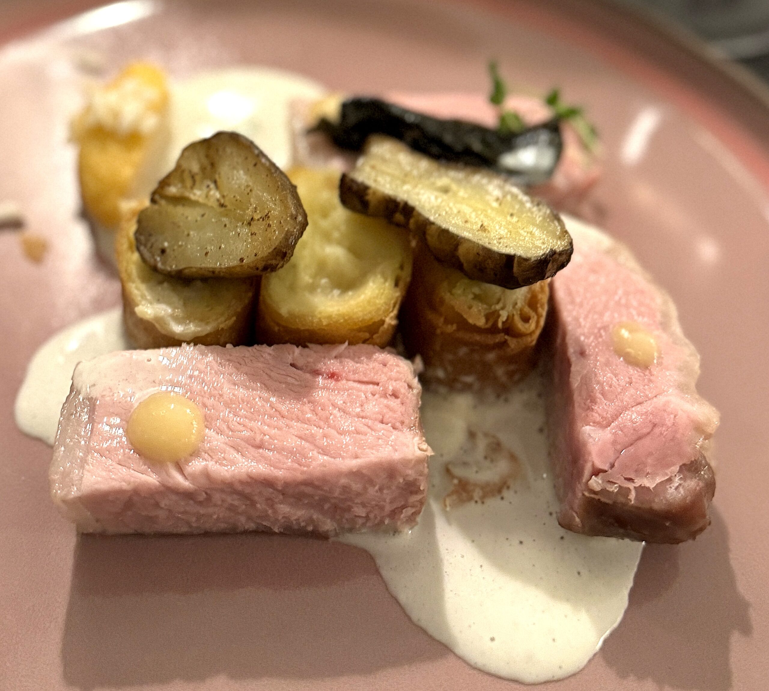 De overzijde kreeg als pièce de rouget met een millefeuille van selderij en rode biet, het geheel in een saus van vissoep, in één woord denderend. Voor mij een wondertje van kleur, de cochon Laborie met aardappeltjes, gefermenteerde knoflook en aardpeer. Volmaakt gegaard vlees