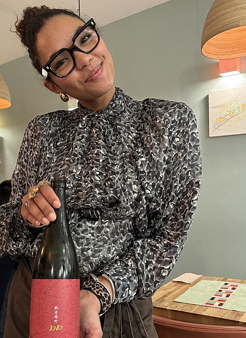 Rève de Pomme (€13), een creatie van appel met groene poederthee en lichte, haast ijl smakende merengue erin gestoken. Hierbij maakte de uitstekende vrouwelijke bediening de fout goed van haar collega door ons een glas sake aan te bieden. Normaal niet iets waar ik blij van wordt, maar met top sommelière Akiko Tanaka in ons team voel ik de hete adem van sake in mijn nek. En ik zeg het zonder aarzelen: deze sake was werkelijk prima, de Omachi 3080 Junmai met 16 procent alcohol.