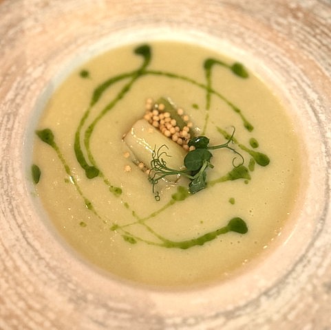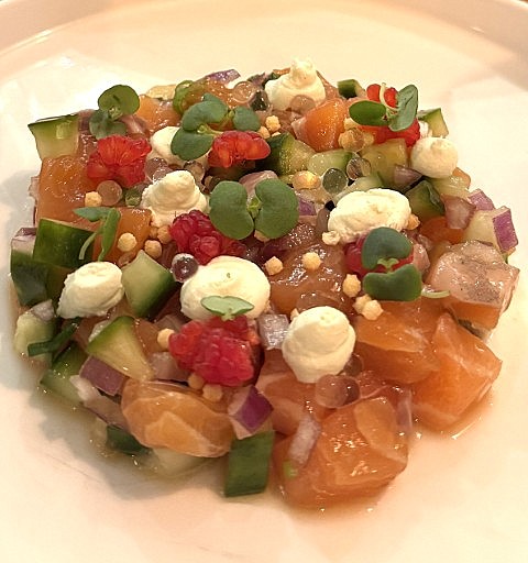 Vooraf nemen wij de vichyssoise (€13) een volmaakte soep van aardappel en gegaarde stukjes prei met druppels knalgroene olie eromheen. Zálig en zeker het subtiele gebruik van soja valt zeer goed. Aan de overzijde arriveert een tartaar van zalm (€13). Een prachtig en harmonieus gerechtje met wat rode ui en stukjes framboos, doorzichtige parels van yuzu, gemarineerde komkommer, shiso blaadjes, en toefjes crème van mascarpone