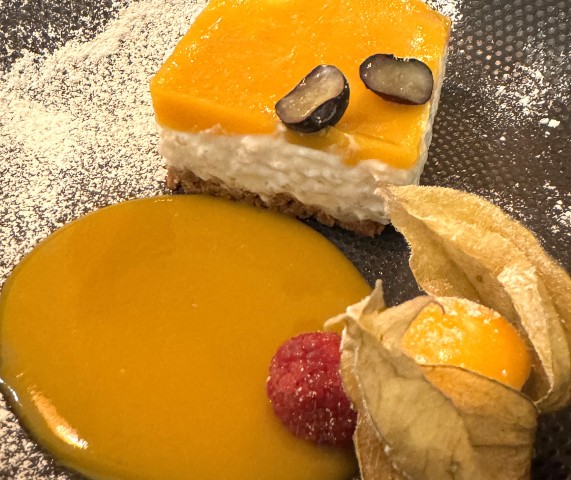 ernaast een buitengewoon goede eendenborst (€28). De wijn van Graillot kan het er heel goed mee vinden. Tot slot komen twee desserts ter tafel die werkelijk prima zijn. Het eerste is een krokant vierkantje van stevige, in melk gegaarde rijst met ‘perles de Japon’, kleine doorzichtige tapioca balletjes op een krokant koekje, afgetopt met een coulis van geel fruit en een saus van hetzelfde (€12). Voorts de