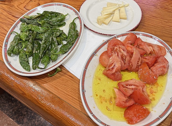 krijtdroge, hyper frisse Txakoli. Direct komt er een salade van grote stukken tomaat met zeezout besprenkeld en overgoten met zeldzaam fraaie olijfolie plus frisse azijn. Ernaast zet men een bord vol glinsterende groene padrón pepertjes, zo uit de oven, alsmede een klein bordje